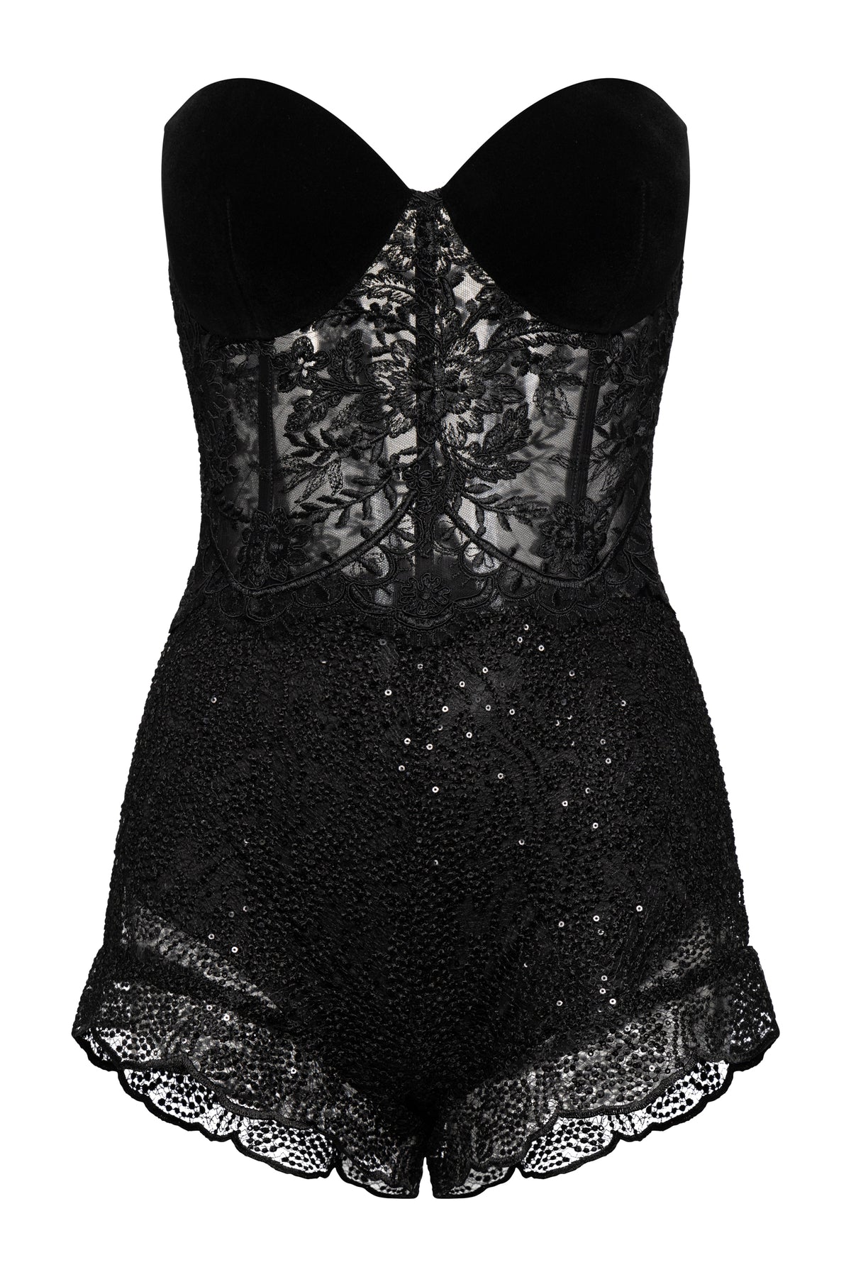 Crafted entirely from delicate lace, this two-piece set blends elegance with bold femininity. The structured lace corset defines the waist and enhances the silhouette, featuring velvet-covered cups that add a luxurious contrast in texture. The matching lace shorts complete the look with a refined yet modern edge, offering both comfort and confidence.